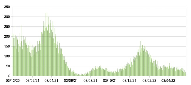 Stabile rispetto a ieri il tasso di positività giornaliero; in questo periodo comunque si registrano valori più alti dello stesso rispetto allo scorso anno; il valore odierno ad esempio è 6 volte maggiore di quello del giorno 28/05/21.