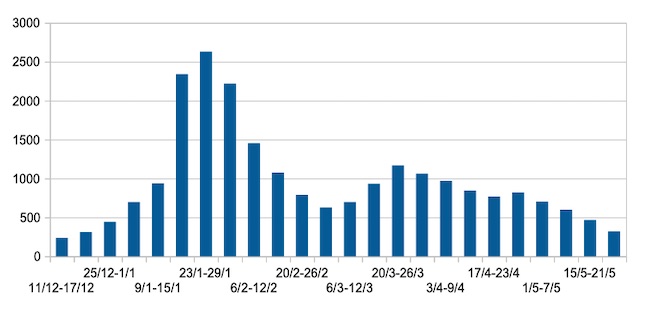 Nel grafico sono riportati i valori medi settimanali.Il valore medio della settimana 22/5/22-28/5/22 è 321,16(la scorsa settimana era 466,70).