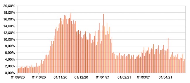 Il grafico mostra la percentuale di tamponi positivi giornalieri su tamponi giornalieri testati ( diagnostici+quelli di controllo) nel periodo 1 settembre 2020 – 29 aprile 2021 in Italia.