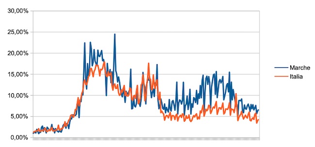 Il grafico seguente illustra l’andamento della percentuale giornaliera di nuovi casi positivi rispetto al corrispondente numero di tamponi (diagnostici +quelli di controllo) effettuati a livello nazionale e nella regione Marche nel periodo 1 settembre 2020 – 29 aprile 2021.
