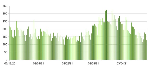 Il grafico seguente mostra i dati giornalieri relativi ai nuovi ingressi in terapia intensiva nelle Marche 3 dicembre 2020 – 29 aprile 2021.