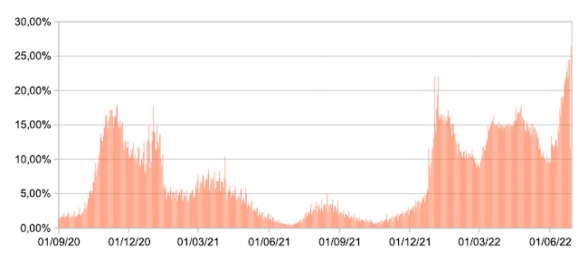 Il grafico mostra la percentuale di tamponi positivi giornalieri su tamponi giornalieri testati ( diagnostici+quelli di controllo) nel periodo 1 settembre 2020 – 29 giugno 2022 in Italia.
