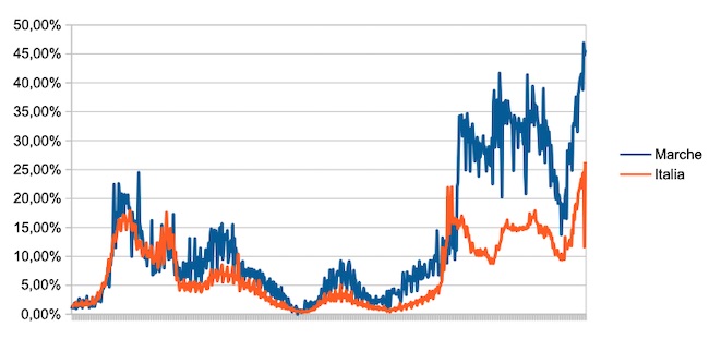 Sale rispetto a ieri il tasso di positività giornaliero nelle Marche.In questo periodo si registrano valori più alti dello stesso rispetto allo scorso anno; il valore odierno ad esempio è 111 volte maggiore di quello del giorno 29/06/21( era 0,41%).