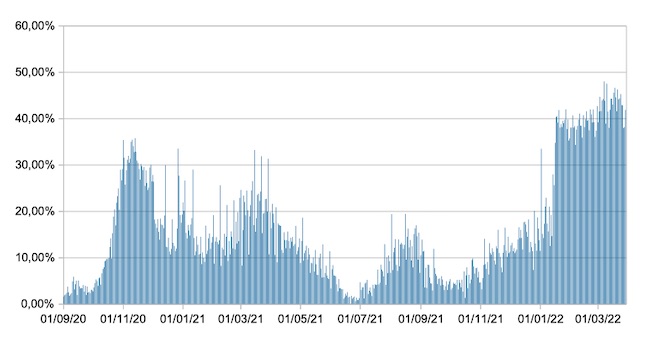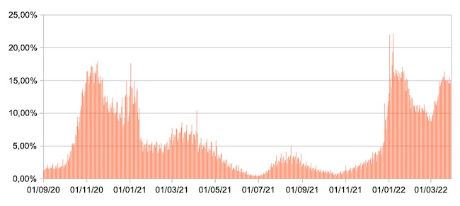 Il grafico mostra la percentuale di tamponi positivi giornalieri su tamponi giornalieri testati ( diagnostici+quelli di controllo) nel periodo 1 settembre 2020 – 29 marzo 2022 in Italia.