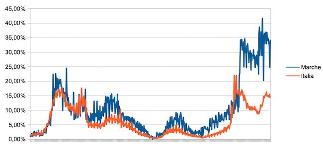 Il grafico seguente illustra l’andamento della percentuale giornaliera di nuovi casi positivi rispetto al corrispondente numero di tamponi (diagnostici +quelli di controllo) effettuati a livello nazionale e nella regione Marche nel periodo 1 settembre 2020 – 29 marzo 2022.