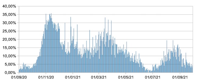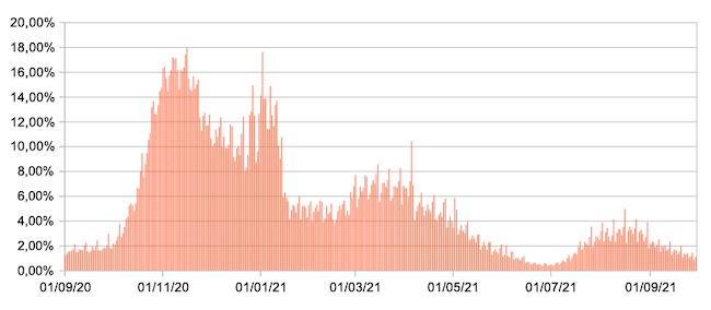 Il grafico mostra la percentuale di tamponi positivi giornalieri su tamponi giornalieri testati ( diagnostici+quelli di controllo) nel periodo 1 settembre 2020 –29 settembre 2021 in Italia.