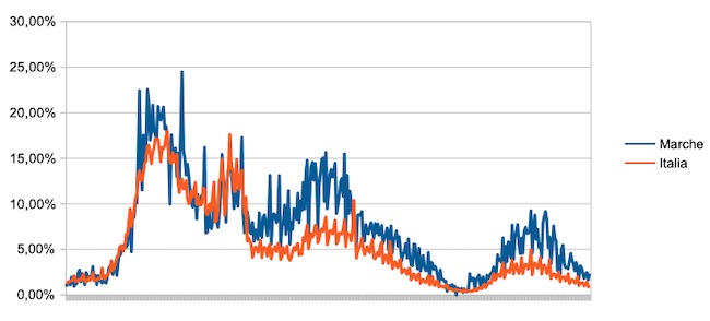 Il grafico seguente illustra l’andamento della percentuale giornaliera di nuovi casi positivi rispetto al corrispondente numero di tamponi (diagnostici +quelli di controllo) effettuati a livello nazionale e nella regione Marche nel periodo 1 settembre 2020 – 29 settembre 2021.