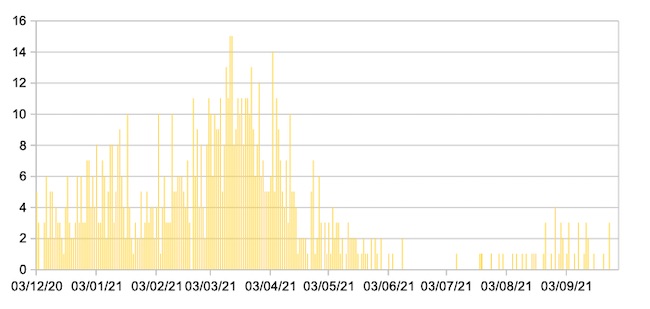 Il grafico seguente mostra i dati giornalieri relativi ai nuovi ingressi in terapia intensiva nelle Marche 3 dicembre 2020 – 29 settembre 2021.