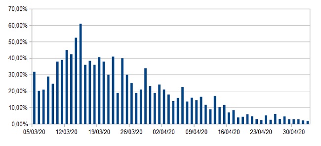 Il grafico sull’andamento dei contagi giornalieri nelle Marche nel periodo 4 marzo – 3 maggio 2020.