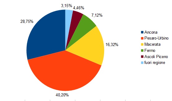 La provincia di Pesaro Urbino continua ad essere la più colpita dall’inizio del contagio ; la provincia di Ascoli Piceno si dimostra invece in assoluto la meno colpita di tutta la regione Marche.