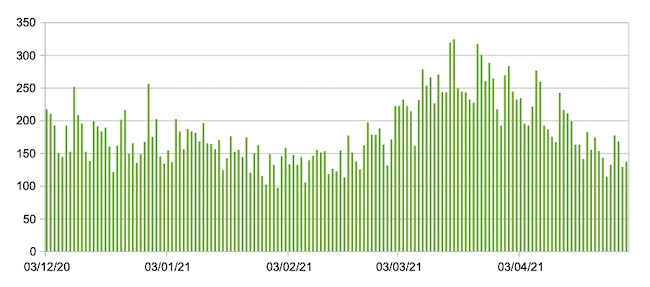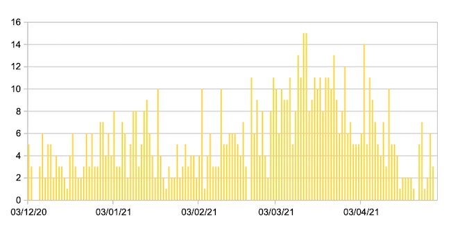 Il grafico seguente mostra i dati giornalieri relativi ai nuovi ingressi in terapia intensiva nelle Marche 3 dicembre 2020 – 30 aprile 2021.