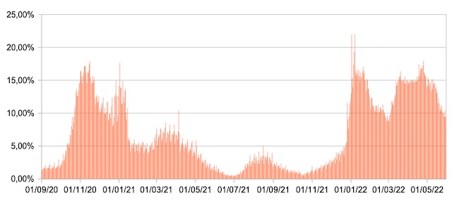 Il grafico mostra la percentuale di tamponi positivi giornalieri su tamponi giornalieri testati ( diagnostici+quelli di controllo) nel periodo 1 settembre 2020 –30 maggio 2022 in Italia.