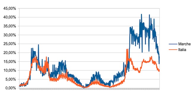 Il grafico seguente illustra l’andamento della percentuale giornaliera di nuovi casi positivi rispetto al corrispondente numero di tamponi (diagnostici +quelli di controllo) effettuati a livello nazionale e nella regione Marche nel periodo 1 settembre 2020 – 30 maggio 2022.