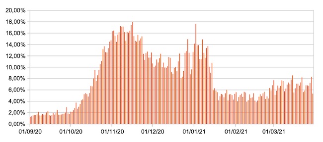 Il grafico mostra la percentuale di tamponi positivi giornalieri su tamponi giornalieri (nuove diagnosi) nel periodo 1 settembre 2020 – 30 marzo 2021 nelle Marche