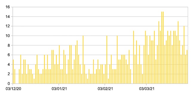 Il grafico seguente mostra i dati giornalieri relativi ai nuovi ingressi in terapia intensiva nelle Marche 3 dicembre 2020 – 30 marzo 2021.