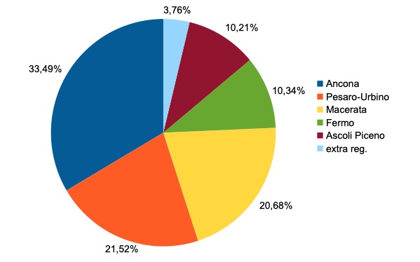 Del totale dei casi positivi 29.324 si riferiscono alla provincia di Ancona, 18.839 a quella di Pesaro-Urbino ,18102 alla provincia di Macerata,9057 a quella di Fermo, 8.947 a quella di Ascoli Piceno. Il servizio sanitario regionale delle Marche segue anche 3.294 casi fuori regione.