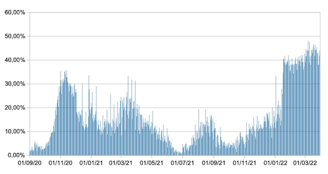Il grafico mostra la percentuale di tamponi positivi giornalieri su tamponi (nuove diagnosi) nel periodo 1 settembre 2020 – 30 marzo 2022 nelle Marche