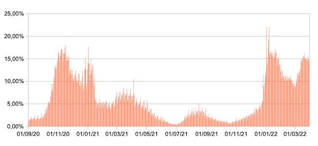 Il grafico mostra la percentuale di tamponi positivi giornalieri su tamponi giornalieri testati ( diagnostici+quelli di controllo) nel periodo 1 settembre 2020 – 30 marzo 2022 in Italia.