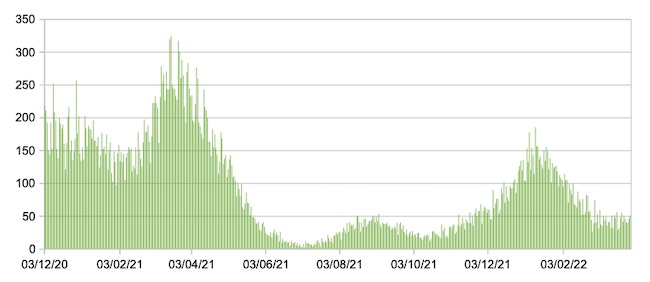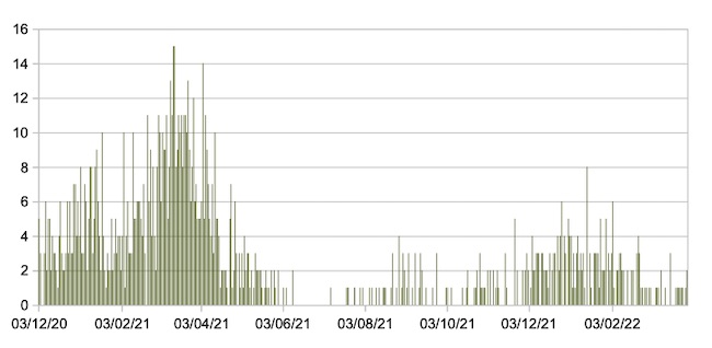 Il grafico seguente mostra i dati giornalieri relativi ai nuovi ingressi in terapia intensiva nelle Marche 3 dicembre 2020 – 30 marzo 2022.