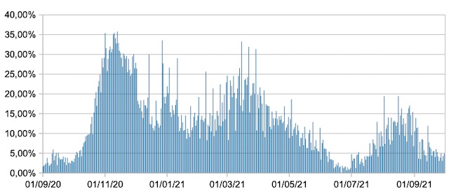 Il grafico mostra la percentuale di tamponi positivi giornalieri su tamponi giornalieri (nuove diagnosi) nel periodo 1 settembre 2020 – 30 settembre 2021 nelle Marche