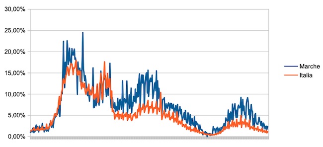 Il grafico seguente illustra l’andamento della percentuale giornaliera di nuovi casi positivi rispetto al corrispondente numero di tamponi (diagnostici +quelli di controllo) effettuati a livello nazionale e nella regione Marche nel periodo 1 settembre 2020 – 30 settembre 2021.