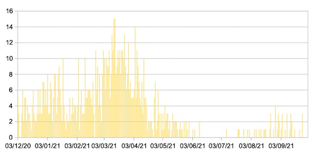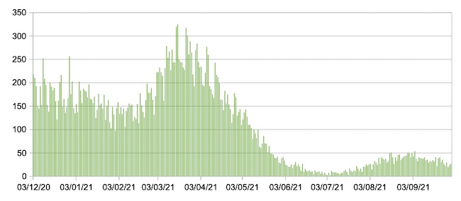 Il grafico seguente mostra i dati giornalieri relativi ai nuovi ingressi in terapia intensiva nelle Marche 3 dicembre 2020 – 30 settembre 2021.