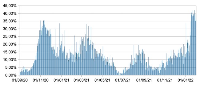 Il grafico mostra la percentuale di tamponi positivi giornalieri su tamponi giornalieri testati ( diagnostici+quelli di controllo) nel periodo 1 settembre 2020 – 31 gennaio 2022 in Italia.