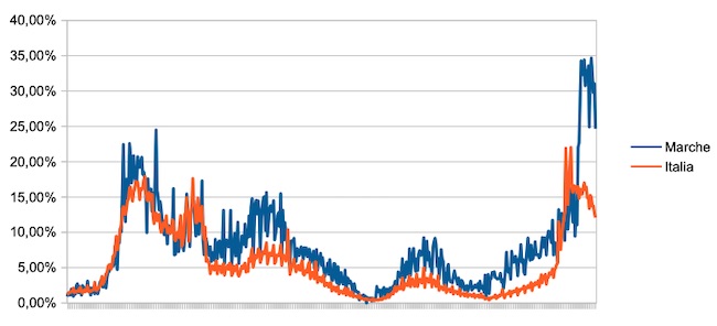 Il grafico mostra la percentuale di tamponi positivi giornalieri su tamponi (nuove diagnosi) nel periodo 1 settembre 2020 – 31 gennaio 2022 nelle Marche