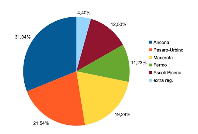 Del totale dei casi positivi 80.968 si riferiscono alla provincia di Ancona, 56.181 a quella di Pesaro-Urbino ,50.314 alla provincia di Macerata,29.300 a quella di Fermo, 32.575 a quella di Ascoli Piceno. Il servizio sanitario regionale delle Marche segue anche 11.483 casi fuori regione.