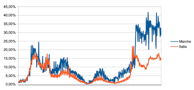 Il grafico seguente illustra l’andamento della percentuale giornaliera di nuovi casi positivi rispetto al corrispondente numero di tamponi (diagnostici +quelli di controllo) effettuati a livello nazionale e nella regione Marche nel periodo 1 settembre 2020 – 4 maggio 2022.