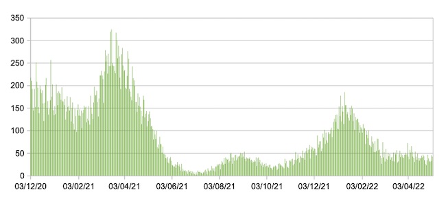 Scende rispetto a ieri il tasso di positività giornaliero; in questo periodo comunque si registrano valori più alti dello stesso rispetto allo scorso anno; il valore odierno ad esempio è quasi il quintuplo di quello del giorno 04/05/21.