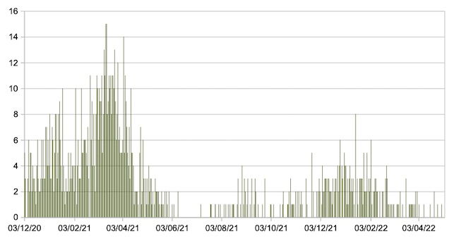 Il grafico seguente mostra i dati giornalieri relativi ai nuovi ingressi in terapia intensiva nelle Marche 3 dicembre 2020 – 4 maggio 2022.