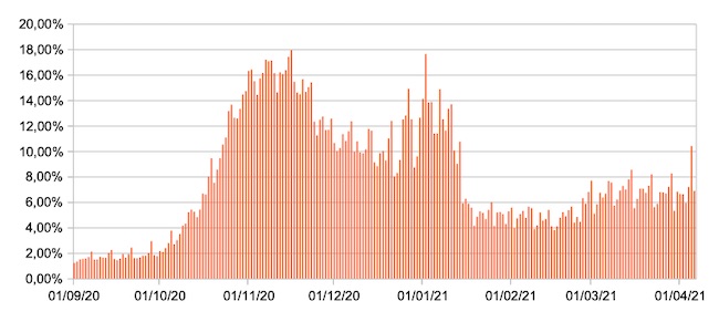 Il grafico mostra la percentuale di tamponi positivi giornalieri su tamponi giornalieri testati ( diagnostici+quelli di controllo) nel periodo 1 settembre 2020 –6 aprile 2021 in Italia.
