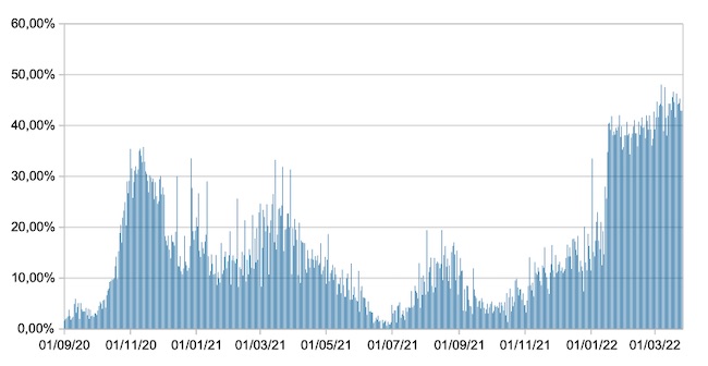 Il grafico mostra la percentuale di tamponi positivi giornalieri su tamponi giornalieri testati ( diagnostici+quelli di controllo) nel periodo 1 settembre 2020 – 26 marzo 2022 in Italia.