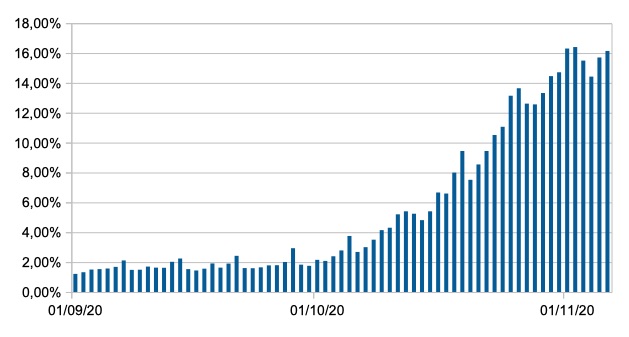 Il grafico mostra la percentuale di tamponi positivi giornalieri su tamponi giornalieri (nuove diagnosi) nel periodo 1 settembre – 6 novembre 2020 nelle Marche