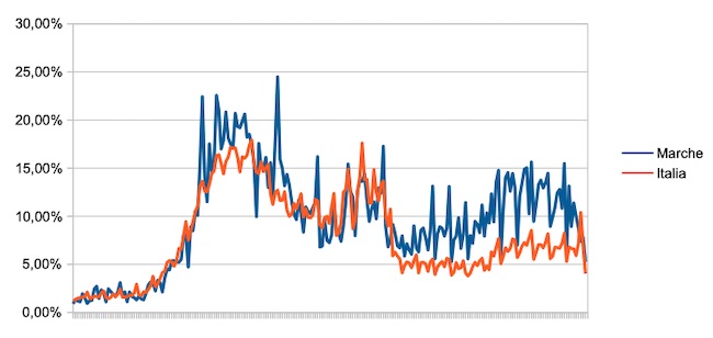 Il grafico seguente illustra l’andamento della percentuale giornaliera di nuovi casi positivi rispetto al corrispondente numero di tamponi (diagnostici +quelli di controllo) effettuati a livello nazionale e nella regione Marche nel periodo 1 settembre 2020 – 7 aprile 2021.