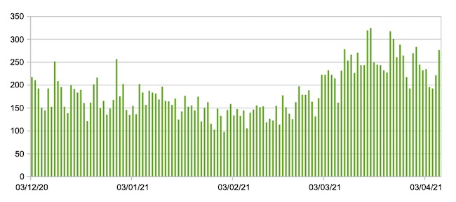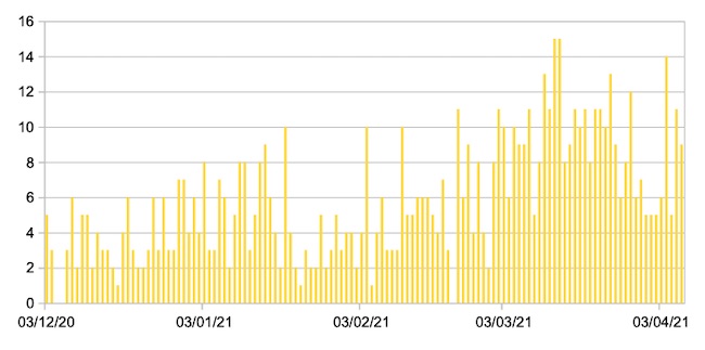 Il grafico seguente mostra i dati giornalieri relativi ai nuovi ingressi in terapia intensiva nelle Marche 3 dicembre 2020 – 7 aprile 2021.
