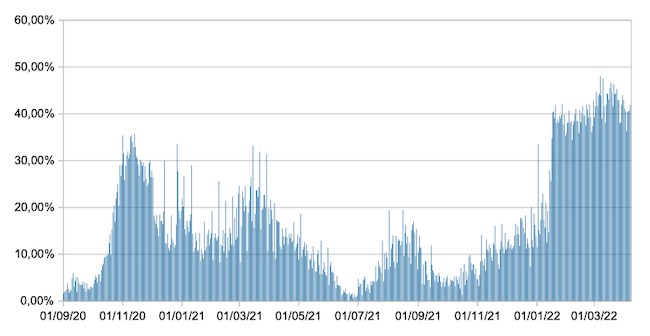 Il grafico mostra la percentuale di tamponi positivi giornalieri su tamponi giornalieri testati ( diagnostici+quelli di controllo) nel periodo 1 settembre 2020 – 7 aprile 2022 in Italia.