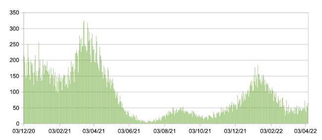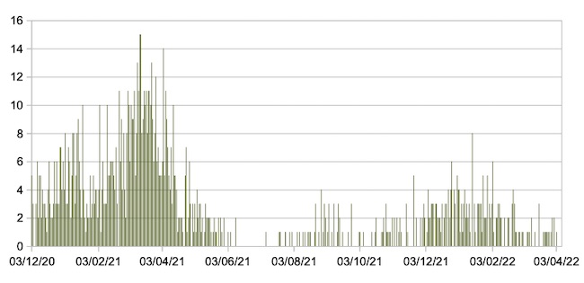 Il grafico seguente mostra i dati giornalieri relativi ai nuovi ingressi in terapia intensiva nelle Marche 3 dicembre 2020 – 7 aprile 2022.