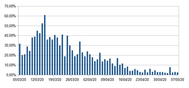 Il grafico sull’andamento dei contagi giornalieri nelle Marche nel periodo 4 marzo –7 maggio 2020.