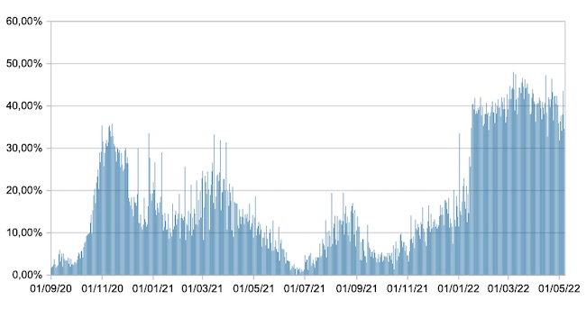 Il grafico mostra la percentuale di tamponi positivi giornalieri su tamponi giornalieri testati ( diagnostici+quelli di controllo) nel periodo 1 settembre 2020 –7 maggio 2022 in Italia.