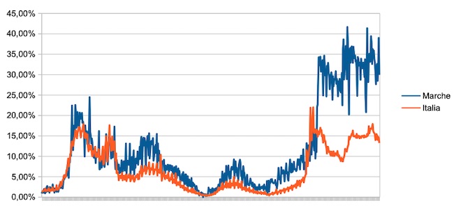 Il grafico seguente illustra l’andamento della percentuale giornaliera di nuovi casi positivi rispetto al corrispondente numero di tamponi (diagnostici +quelli di controllo) effettuati a livello nazionale e nella regione Marche nel periodo 1 settembre 2020 –7 maggio 2022.