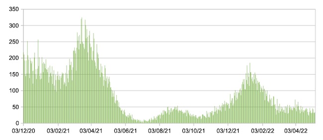 Nel grafico sono riportati i valori medi settimanali.Il valore medio della settimana 1/5/22-7/5/22 è 702,39 (la scorsa settimana era 820,86).