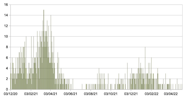Il grafico seguente mostra i dati giornalieri relativi ai nuovi ingressi in terapia intensiva nelle Marche 3 dicembre 2020 – 7 maggio 2022.