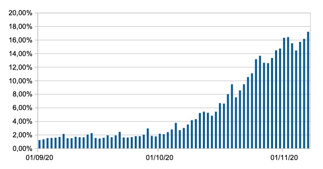 Il grafico mostra la percentuale di tamponi positivi giornalieri su tamponi giornalieri (nuove diagnosi) nel periodo 1 settembre – 7 novembre 2020 nelle Marche