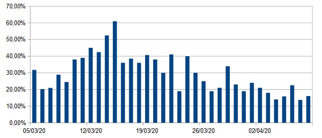 Il grafico sull’andamento dei contagi giornalieri nelle Marche nel periodo 4 marzo – 8 aprile 2020
