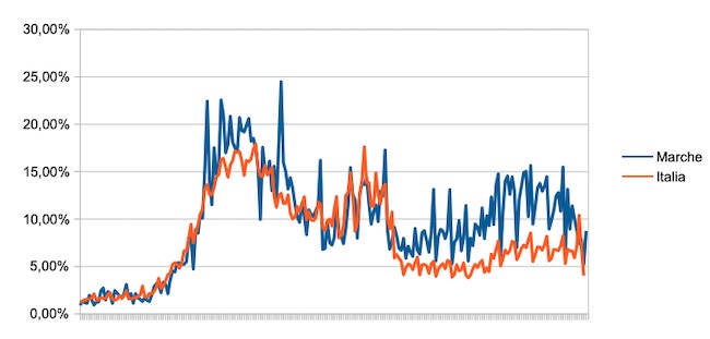 Il grafico seguente illustra l’andamento della percentuale giornaliera di nuovi casi positivi rispetto al corrispondente numero di tamponi (diagnostici +quelli di controllo) effettuati a livello nazionale e nella regione Marche nel periodo 1 settembre 2020 – 8 aprile 2021.