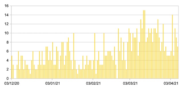 Il grafico seguente mostra i dati giornalieri relativi ai nuovi ingressi in terapia intensiva nelle Marche 3 dicembre 2020 – 8 aprile 2021.