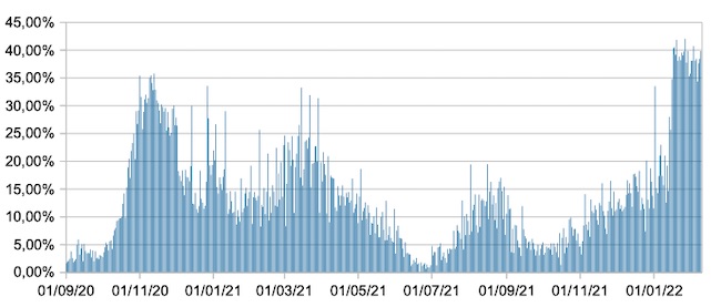 Il grafico mostra la percentuale di tamponi positivi giornalieri su tamponi giornalieri testati ( diagnostici+quelli di controllo) nel periodo 1 settembre 2020 – 9 febbraio 2022 in Italia.
