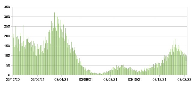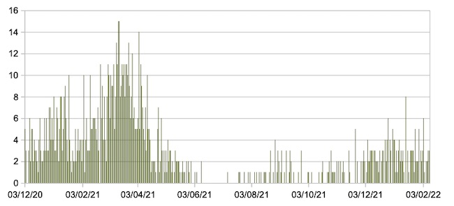 Il grafico seguente mostra i dati giornalieri relativi ai nuovi ingressi in terapia intensiva nelle Marche 3 dicembre 2020 – 9 febbraio 2022.